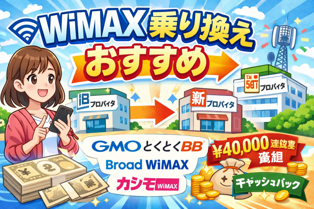 WiMAXの乗り換えを検討中の方に結論からお伝えすると、2026年2月現在、乗り換え先として最もおすすめのプロバイダはGMOとくとくBB WiMAXです。最大40,000円の違約金負担キャンペーンに加え、全員対象のキャッシュバックも併用できるため、トータルコストを... -