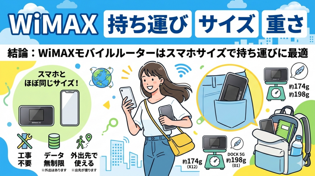 結論:WiMAXモバイルルーターはスマホサイズで持ち運びに最適 2026年2月現在、WiMAXのモバイルルーターは全機種スマホとほぼ同じサイズ感で、重さも約174g〜225gです。最軽量のSpeed Wi-Fi 5G X12は約174g(iPhone 13とほぼ同じ)、最新のDOCK 5G 01は約19... -
