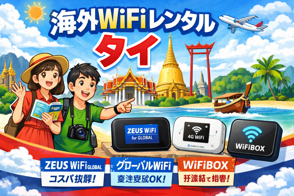 タイ旅行で海外WiFiレンタルを検討中の方に結論からお伝えすると、コスパ重視なら「ZEUS WiFi for GLOBAL」、安定性と空港受取の手軽さなら「グローバルWiFi」、非接触でサッと借りたいなら「WiFiBOX」がおすすめです。この記事では主要6社の料金・データ... -