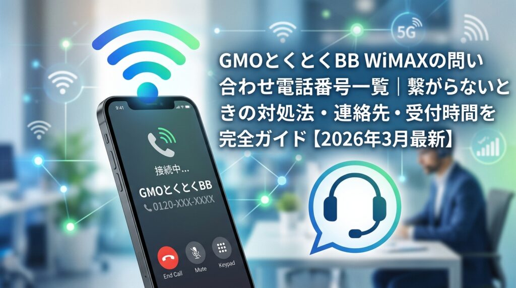 GMOとくとくBB WiMAXの問い合わせ電話番号一覧|繋がらないときの対処法・連絡先・受付時間を完全ガイド【2026年3月最新】 GMOとくとくBB WiMAXに問い合わせたいけれど、電話番号がわからない、電話が繋がらないとお困りではありませんか。この記事では、... -