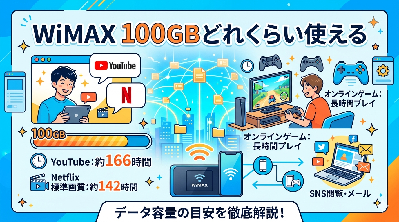 「WiMAXで100GB使えたら、どれくらい動画やゲームを楽しめるの?」と疑問に思っている方は多いのではないでしょうか。結論から言うと、100GBあればYouTubeの標準画質で約166時間、Netflixの標準画質で約142時間の動画視聴が可能です。ただし、高画質視聴やWeb会議を頻繁に行う方には100GBでは不足する可能性があり、WiMAXの実質無制限プランの方がおすすめです。