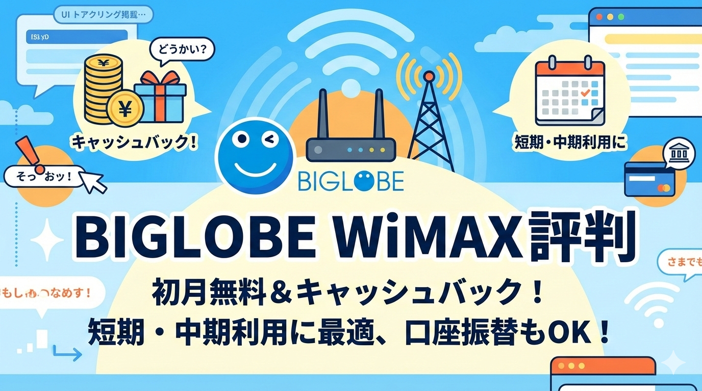 BIGLOBE WiMAXの契約を検討中で「本当に大丈夫?」と気になっている方へ。結論から言うと、BIGLOBE WiMAXは初月無料・24ヶ月間の月額割引・翌月受取のキャッシュバックが揃い、1〜2年の短期〜中期利用に非常に強いプロバイダです。口座振替にも対応しており、クレジットカードを持っていない方にとっては最有力候補と言えます。