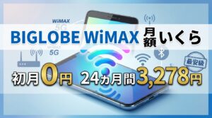 BIGLOBE WiMAX +5Gは、ビッグローブ株式会社が提供するモバイル通信サービスです。データ容量無制限の定額制で、初月0円・1〜24カ月目は月額3,278円(税込)で利用できます。2022年7月1日以降に契約した方には最低利用期間や違約金の設定がなく、いつ解約しても契約解除料はかかりません。なお、2026年5月利用分よりプラン料金が4,928円(税込)に改定され、同時にベーシックコース(月額220円)は廃止となるため、実質的な月額料金に変更はありません。BIGLOBE WiMAXの総合的な評価については、BIGLOBE WiMAXの評判・口コミを本音で徹底解説した記事もあわせてご覧ください。