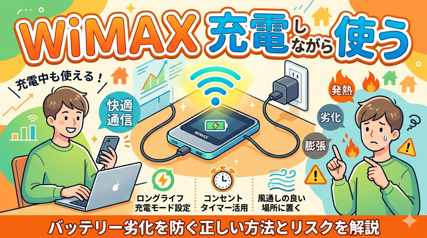 WiMAXのモバイルルーターは充電しながら使えます。ただし、充電しっぱなしの運用はバッテリー劣化・発熱・膨張のリスクがあるため、正しい対策が不可欠です。この記事では、WiMAXを充電しながら安全に使う方法とバッテリーを長持ちさせるコツを、最新機種の情報を交えて徹底解説します。