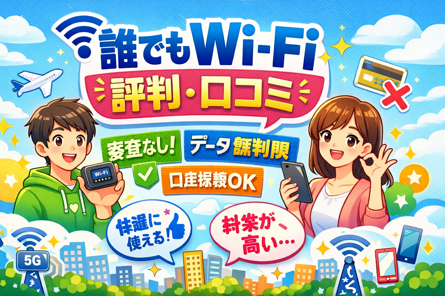「誰でもWi-Fi」は審査不要・口座振替対応で、データ無制限のWi-Fiが持てるサービスです。結論から言うと、クレジットカードなし・信用情報に不安がある方にとっては非常に心強い選択肢ですが、月額料金の高さや2年縛りといった注意点もあります。この記事では実際の口コミ・評判をもとに、メリット・デメリットを本音で解説します。