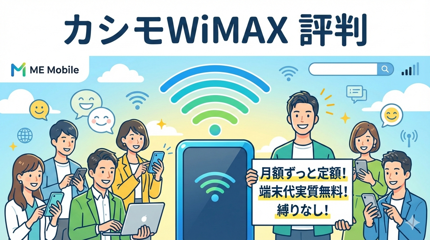 カシモWiMAXは、月額料金がずっと定額で分かりやすい料金体系、端末代実質無料、契約期間の縛りなし・違約金0円というシンプルさが最大の魅力です。実際のユーザーの口コミでも、料金のわかりやすさ、通信速度の安定性、サポート対応の良さが高く評価されています。