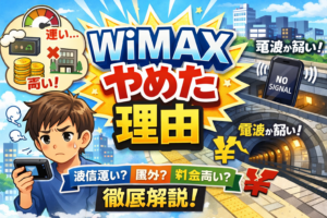 WiMAXで最も多い後悔が「自宅や職場で電波が届かなかった」というケースです。WiMAXの対応エリアは年々拡大していますが、地下、建物の奥、山間部などでは電波が届きにくい場合があります。契約前に必ずUQ WiMAXの公式サイトでエリア確認を行い、さらに心配な場合は「Try WiMAX」で15日間無料お試しすることを強くおすすめします。エリア確認の具体的な手順については、WiMAXのエリア確認方法を徹底解説|サービスエリアマップ・ピンポイント判定・Try WiMAXまで失敗しない手順を完全ガイド【2026年2月最新】で詳しく解説しています。