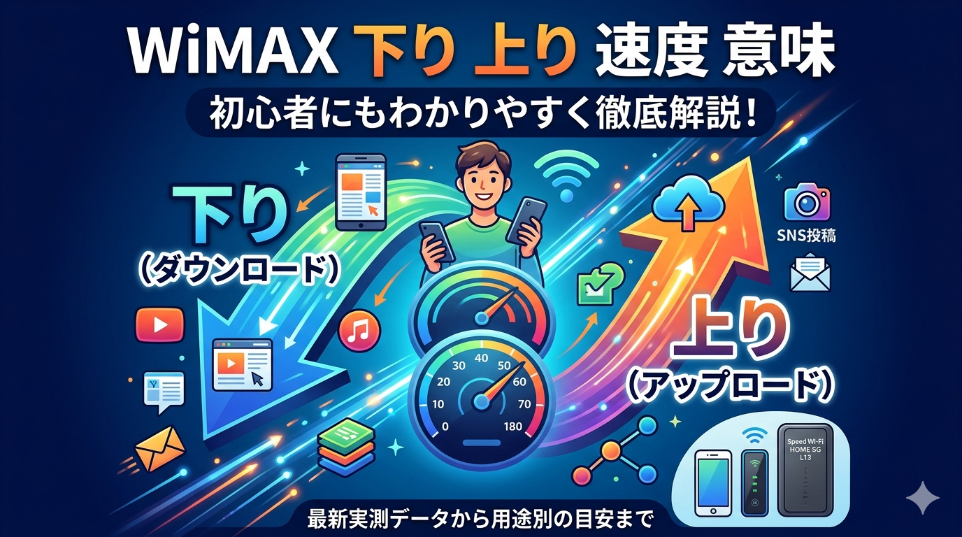 WiMAXの通信速度で目にする「下り」「上り」とは、データの流れる方向を表す言葉です。下り(ダウンロード)はWebサイトの閲覧や動画再生時の受信速度、上り(アップロード)はSNS投稿やファイル送信時の送信速度を意味します。この記事では、WiMAXの下り・上り速度の仕組みから実測データ、用途別に必要な速度の目安、速度が遅いときの対処法まで、初心者にもわかりやすく徹底解説します。