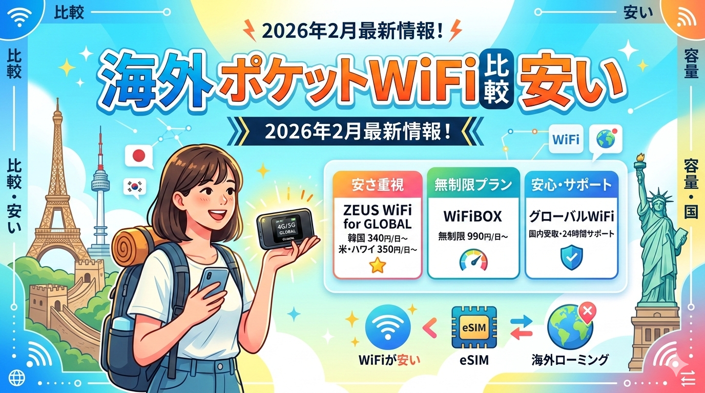 海外旅行や出張で使えるポケットWiFiレンタルを「どこが一番安いのか」徹底比較しました。結論からお伝えすると、料金の安さではZEUS WiFi for GLOBALとWiFiBOXが頭一つ抜けており、サポート重視ならグローバルWiFiが最も安心です。2026年2月最新の料金・容量・対応国を一覧表で比較し、eSIMや海外ローミングとの違いまで詳しく解説します。