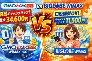 2026年2月現在、GMOとくとくBB WiMAXでは最大43,400円以上のキャッシュバック、Broad WiMAXでは最大37,000円のキャッシュバック、BIGLOBE WiMAXでは11,500円のキャッシュバックが用意されています。さらにGMOとくとくBBでは他社からの乗り換え時に違約金補助として追加のキャッシュバックもあるため、実質的な負担を大幅に抑えて乗り換えることが可能です。