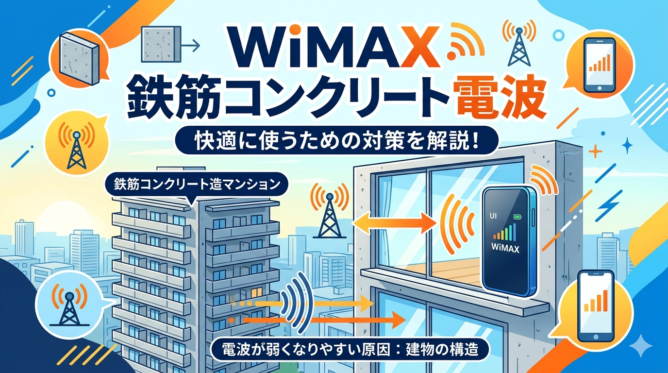 WiMAXは鉄筋コンクリート造のマンションでも使えますが、建物の構造上、電波が弱くなりやすいのは事実です。ただし、端末の設置場所やプラスエリアモードの活用など、適切な対策をとれば快適に利用できるケースが大半です。この記事では、鉄筋コンクリート環境でWiMAXの電波が弱くなる原因から、すぐに実践できる改善策、契約前に確認すべきポイントまでを網羅的に解説します。