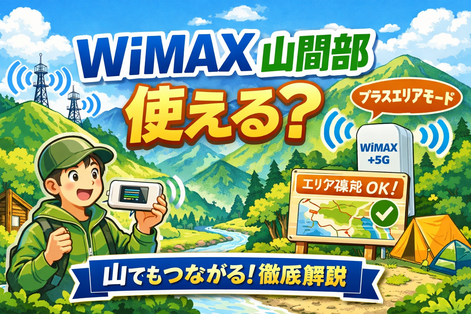 WiMAXは山間部でも使えるのか——結論から言えば、スタンダードモードだけでは厳しい場面があるものの、プラスエリアモード(auプラチナバンド)の活用やエリア事前確認を行えば、十分に実用レベルで利用できます。本記事では2026年最新情報をもとに、具体的な対処法・実測データ・代替手段まで徹底解説します。