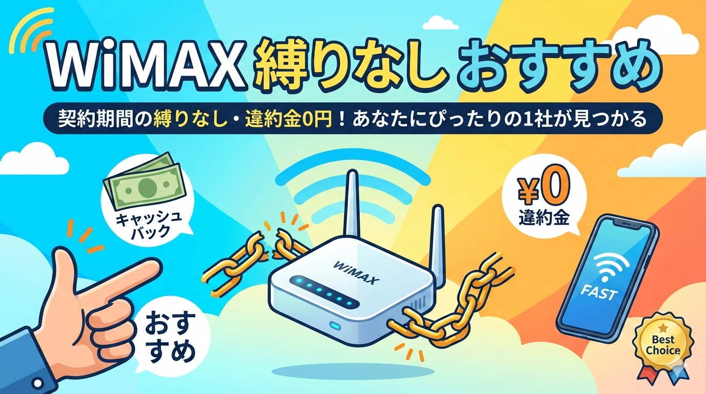 WiMAXを契約したいけれど、長期の契約縛りに不安を感じていませんか。2022年の電気通信事業法改正以降、契約期間の縛りなし・違約金0円のWiMAXプロバイダが続々と登場しています。この記事では、縛りなしで使えるWiMAXプロバイダ5社を実質月額料金・端末代金・キャッシュバックの観点から徹底比較し、あなたに合った1社が見つかるよう解説します。