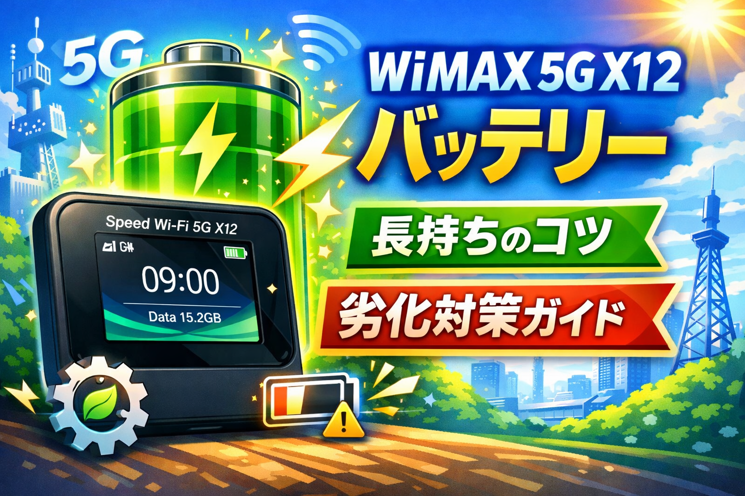 WiMAXのモバイルルーター「Speed Wi-Fi 5G X12」は、4,000mAhのバッテリーを搭載し連続通信約9時間を実現していますが、バッテリー交換ができない内蔵型のため、長持ちさせる設定や劣化時の対処法を事前に知っておくことが重要です。本記事では、X12のバッテリーに関する全情報を徹底解説します。