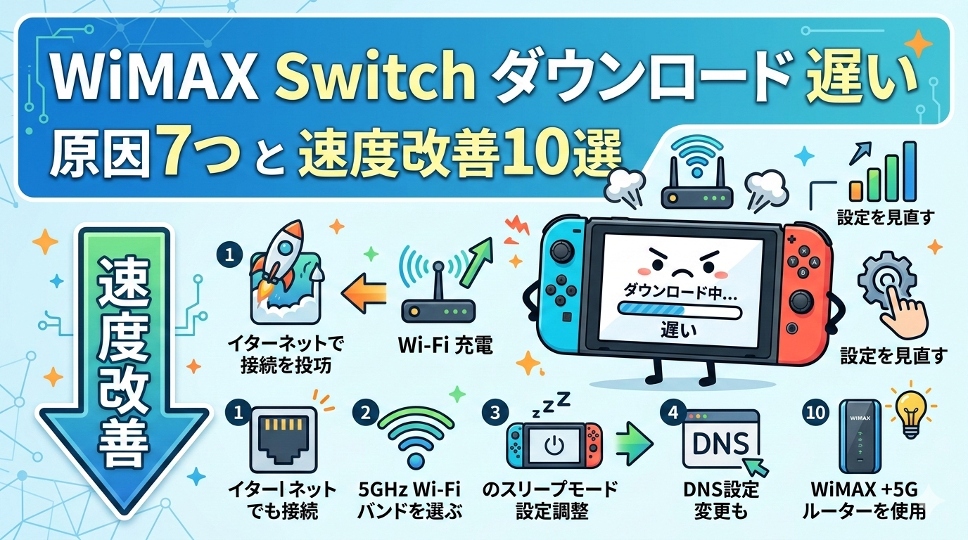 WiMAXでNintendo Switchのゲームダウンロードが遅いと感じた場合、原因はWiMAX側(ルーターの設置場所・周波数帯・パフォーマンスモード)とSwitch側(起動中ソフト・DNS/MTU設定・ストレージ容量)の両方に存在します。