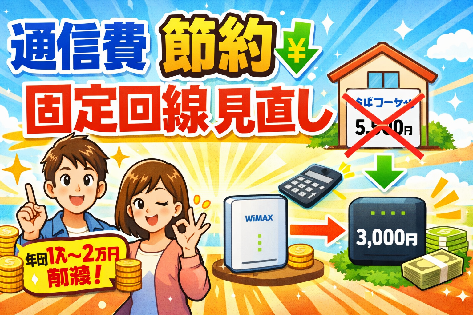 通信費の節約で最もインパクトが大きいのは、固定回線の見直しです。光回線の戸建てプラン(月5,000円〜6,000円)からWiMAXホームルーター(実質月3,641円〜)に切り替えるだけで、年間1万円〜2万円以上のコスト削減が可能になります。さらに格安SIMへの乗り換えとスマホのセット割を組み合わせれば、通信費全体を月5,000円〜7,000円台に抑えることも現実的です。
