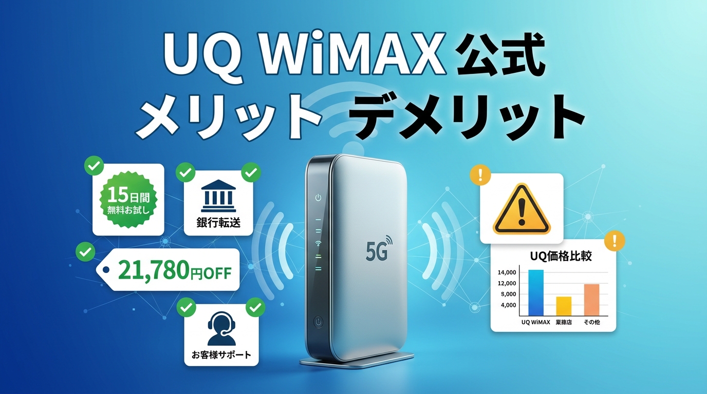 UQ WiMAX公式で契約するメリットは「Try WiMAXで15日間無料お試し」「口座振替対応」「端末割引で最大21,780円OFF」「手厚いサポート」の4点。一方デメリットは「他社プロバイダより月額料金が割高」な点に集約されます。本記事では2026年2月最新の料金・速度・口コミをもとに、UQ WiMAX公式がどんな人に向いているか徹底解説します。