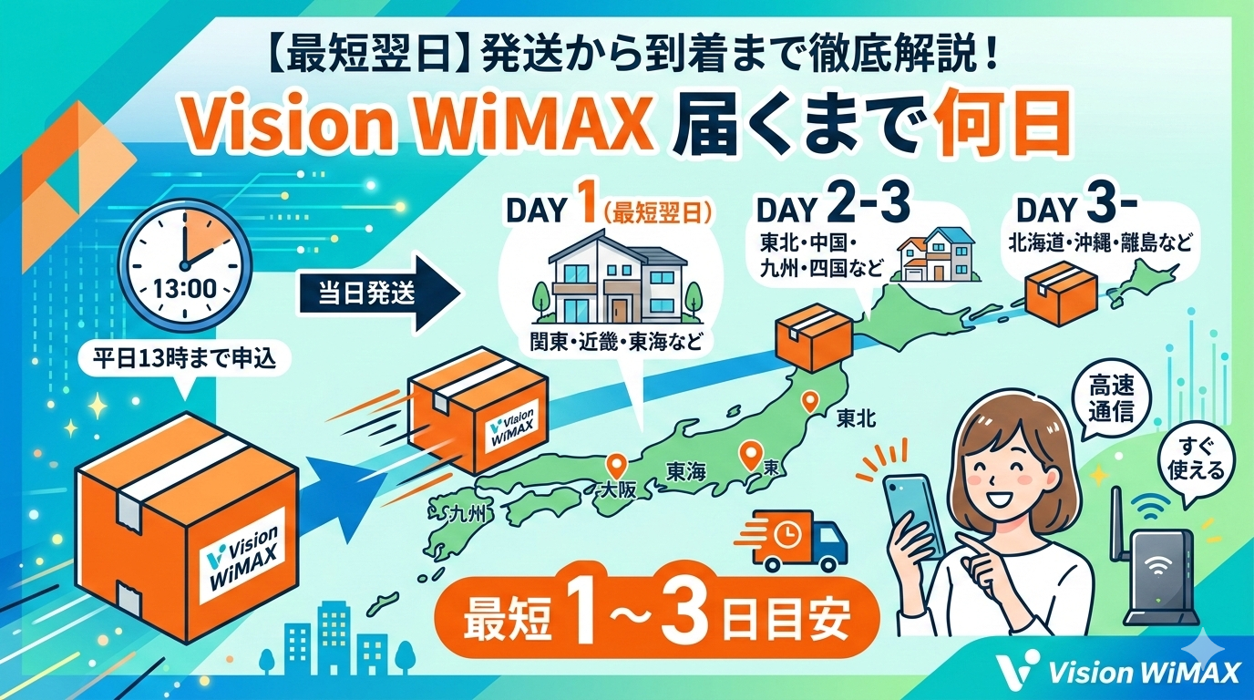 Vision WiMAXの端末が届くまでの日数は、申し込みのタイミングや配送先の地域によって異なります。しかし、結論としては「平日13時までに申し込めば当日発送、発送から1〜3日で到着」というのが目安です。東京や大阪など主要都市圏であれば、申し込みの翌日に届くケースも珍しくありません。